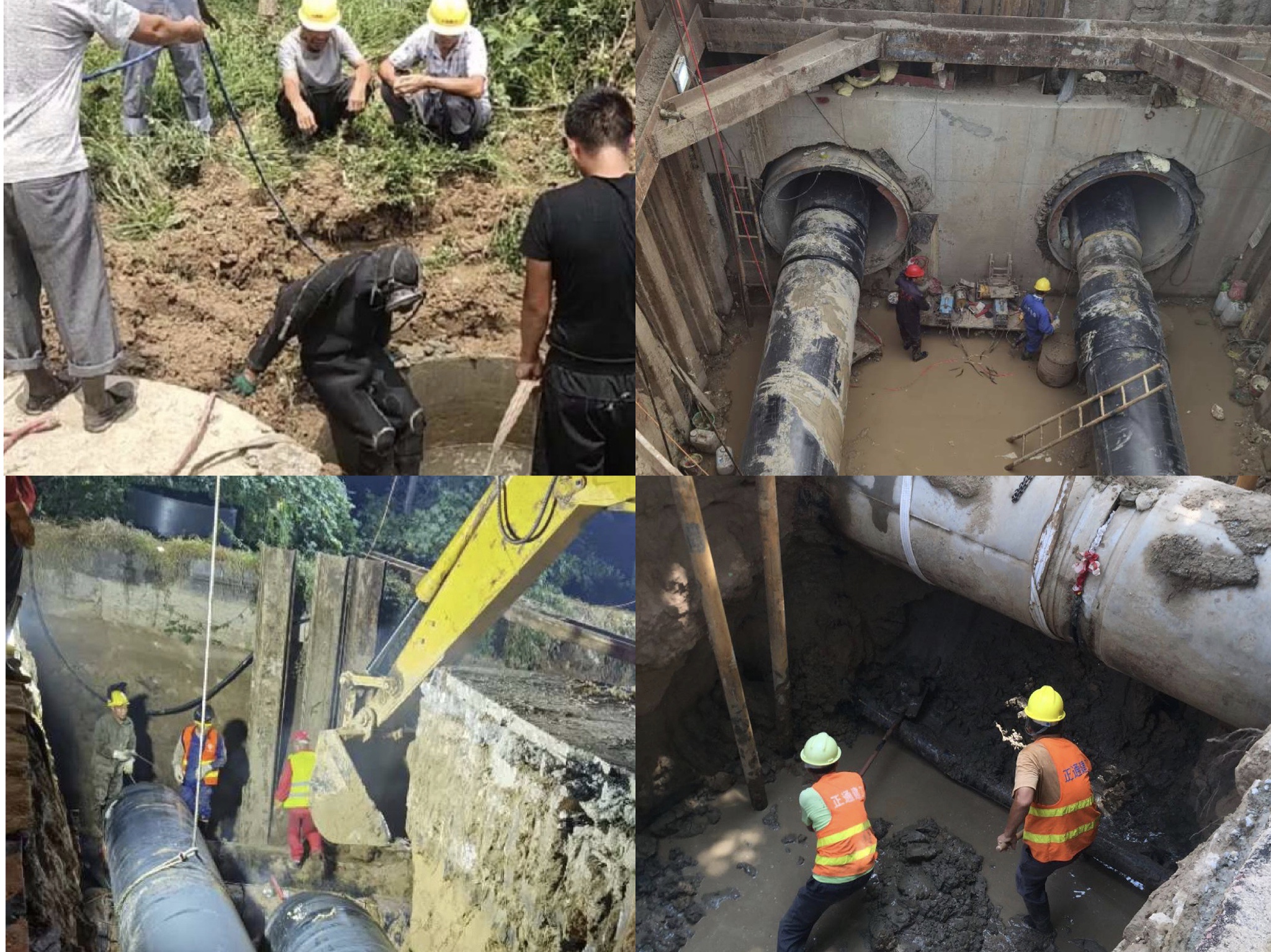 西部熱源替換工程嘉祥電廠線供熱管網(wǎng)總長15.3公里,工程作業(yè)面環(huán)境復雜。涉及清障7.5公里,穿越老運河1處、頂管作業(yè)2處、涵洞4條、并行污水管1公里。面對工期緊、任務重、施工難度大等困難,參與建設的建工集團和熱電集團項目負責人團結(jié)一心,齊抓共管,攻堅克難,全力以赴推進“清障協(xié)調(diào)、施工技術、材料保障”等工作。項目施工中,西一標段匯祥路東段、西二標段等雨水、污水管道,與施工管道并行,且老化嚴重,經(jīng)常出現(xiàn)雨水、污水管網(wǎng)泄露后倒灌溝槽的情況。項目部在地下管網(wǎng)資料不齊全的情況下,采用“蛙人”潛入污水中,探查漏點進行封堵漏。由于工作坑面積大,漏水點位小,“蛙人”們在污水中一處一處用手感應摸排,每次需要潛入污水中數(shù)小時才能完成,對施工工作造成極大困難。安居街道3.7公里施工路段緊鄰老運河,地下水位淺,基坑強排水降水效果不明顯,項目部集思廣益,通過打降水井、地面焊接吊入溝槽減少低水位作業(yè)空間等方式,保障項目如期進行。
