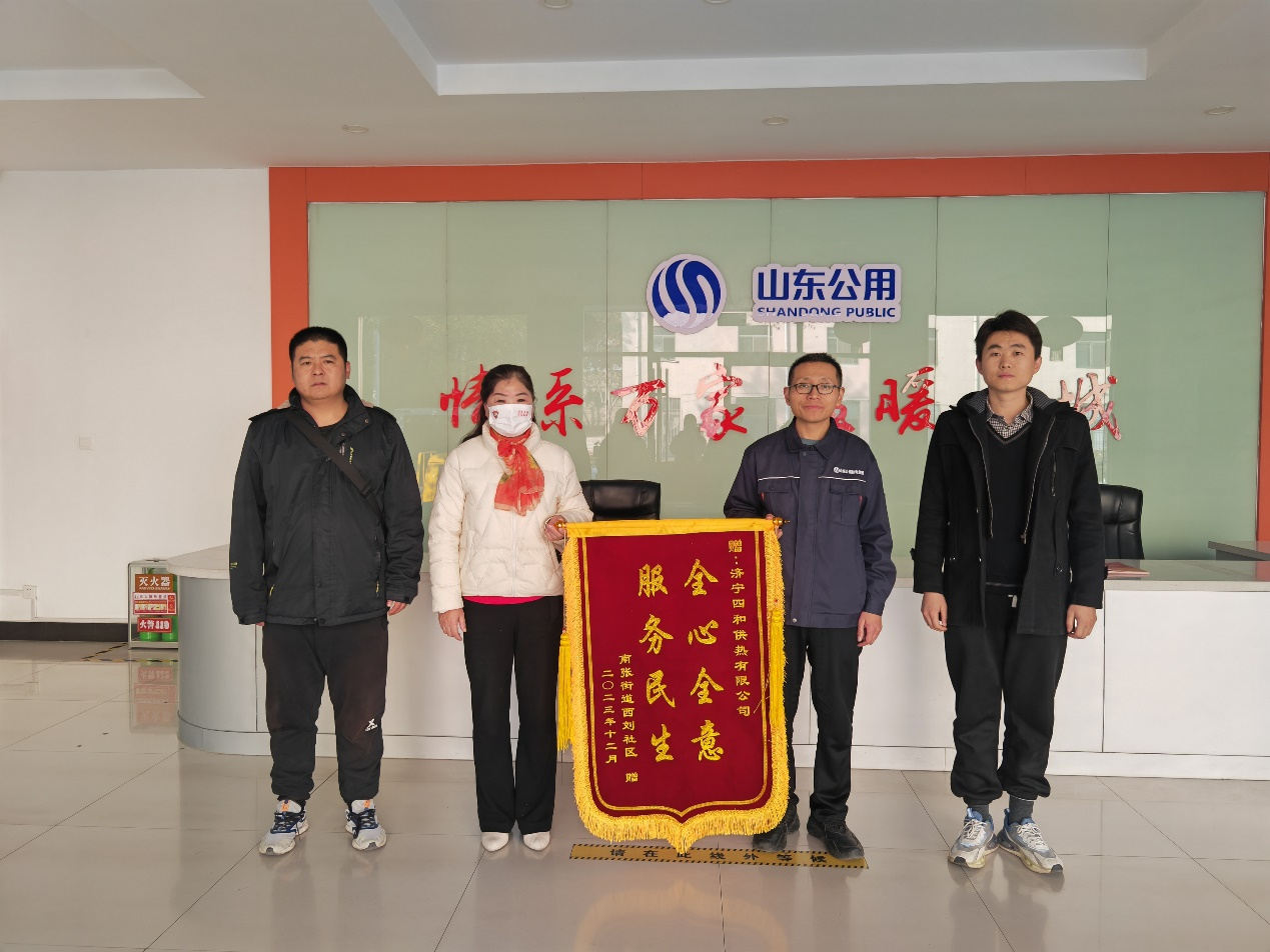 12月5日下午,南張街道西劉社區(qū)的負(fù)責(zé)人將一面印著“全心全意,服務(wù)民生”的錦旗送到了濟(jì)寧四和供熱公司,誠摯地對四和供熱公司的周到服務(wù)以及供熱六區(qū)網(wǎng)格員朱道新的認(rèn)真負(fù)責(zé)表示感謝。